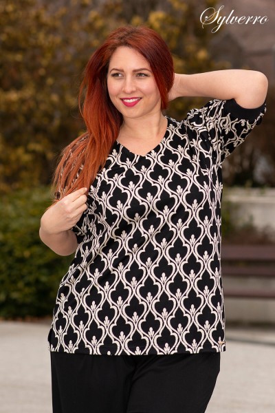 Fashionable, slimming side insert dress with a showy lace opening at the front. Short sleeves, above-the-knee length, made of trendy patterned material. Not too tight, follows the line of the body. Due to its thin material, it does not show anything, so you can feel comfortable in it all day. You can wear it with high heels for an occasion, or with comfortable sneakers for an evening walk. A truly versatile piece.