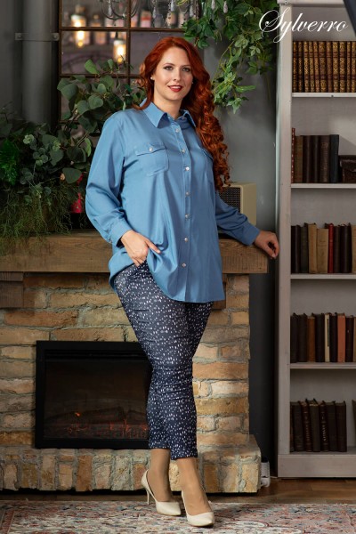 Blouse made of easy-care, pleasant, well-fitting material that requires very little ironing. It closes with buttons at the front and at the cuffs. A beautiful blouse with a small stand-up collar, long sleeves, and a fit below the hip line. The sleeves are gathered with thread elastic. Fashionable and elegant!