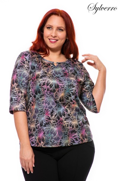 The front is a round neckline, highlighted with a small stone decoration, not too tight-fitting top. It gently follows the body line, is hip-length, and has 3/4 sleeves. It is not clingy, made of beautiful, sophisticated material, so you can wear it for any occasion. Its surface is made even more special with a gold print.