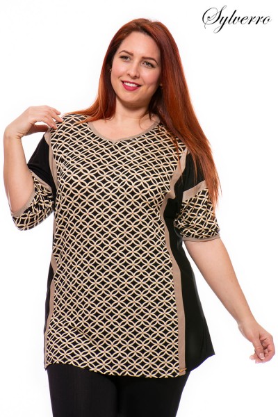 A pretty top with elbow-length sleeves and a strap at the end of the sleeves, with a loose line. The soft, yet durable material does not cling to the body. It does not wrinkle and is easy to care for even after washing. The "V" neckline elongates the figure. There is a barely visible print on the white background.