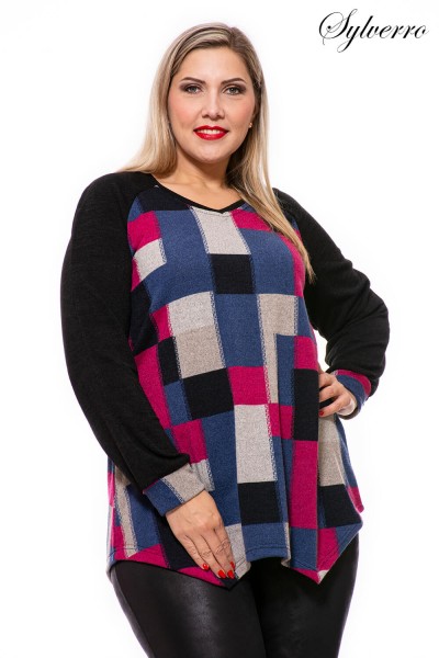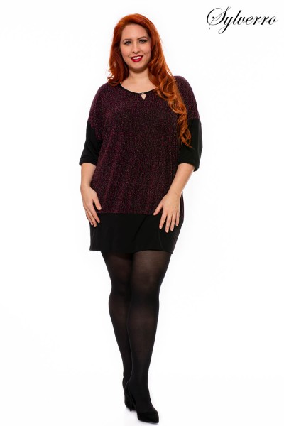 Lurex dress with sexy fishnet sleeves. Not a tight fit, but you can adjust the waist with a tie. At the front, at the neckline, there is a small fishnet insert with shiny black stones. The models are 185 cm tall. The length reaches above the dress. You can also wear it as an extended top.