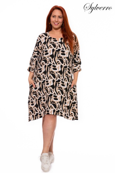 Dress or long top? Casual or everyday? You make it what you want it to be, depending on whether you wear it with tight pants or stockings. Pockets, good fit, widening down strongly, not too big high neckline. Doesn't cling to the body! The model is 180 cm tall, so it reaches her knees, but if you are shorter, it covers the knees as well.