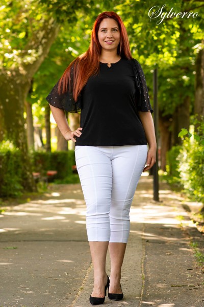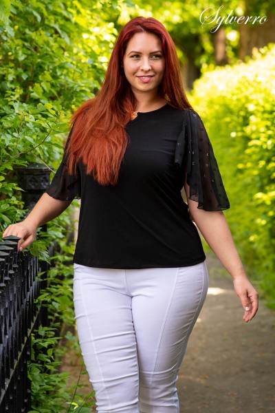 A smartly cut, fashionable and pretty top. The sleeveless base has soft, flowing muslin sleeves sewn into the cut lines. It covers just where it needs to, a comfortable but very elegant piece, complemented by a small ornament in the neckline. The top is made of elastic slinky material.