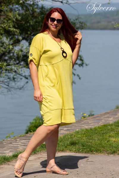 Elastic, soft, well-fitting dress that you can even wear with tight pants. Sporty style, yet thanks to the high-quality, not too thin material, you can wear it anywhere. We made it extra extra with cut lines, it follows the body line at the top, but is flared at the hips. The flare is held together by the bottom strap. Button-up sleeves. A real spring-summer starter piece. S(L-XL),M(2-3XL),L(4-5XL)