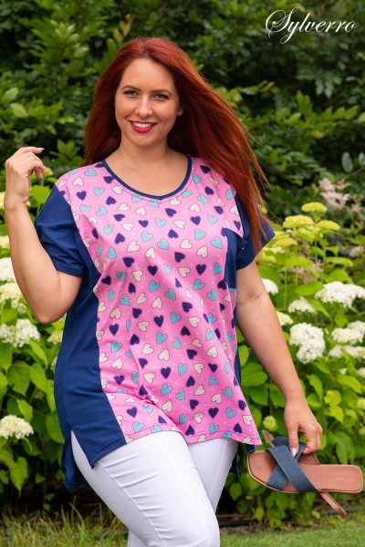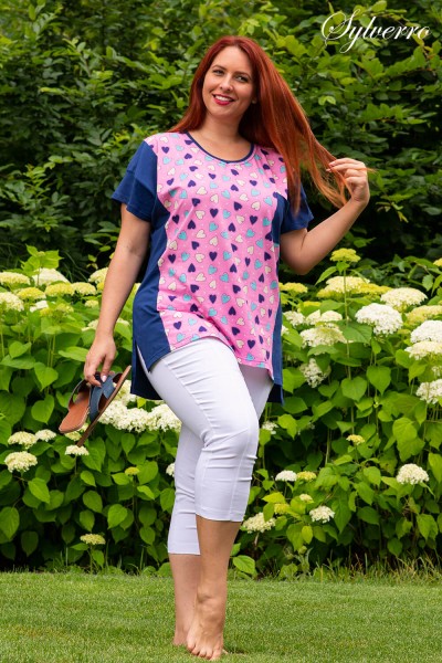 Raglan sleeve top, elongated, flared, with a zigzag hem. The soft, comfortable viscose material drapes over the figure, so it doesn't show anything. Short sleeves, "V" neckline. Our customers' favorite!