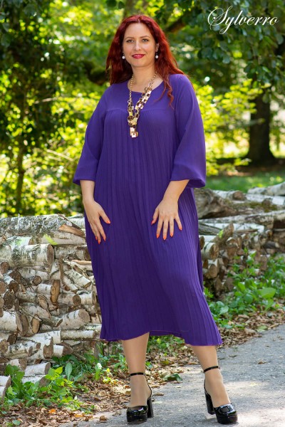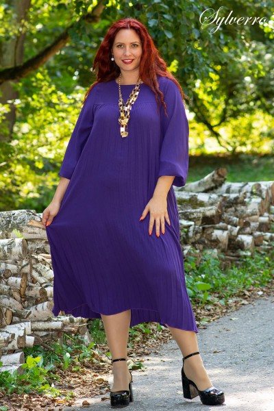 Long dress, pleated at the front and back, made of a nice, fashionable material. Long sleeves, with elastic at the end. Cut at the neckline, where the pleated part starts. You can add a belt, but it looks very showy with a chain. Available in several colors. Italian import. One size, which is good for sizes L-3XL.