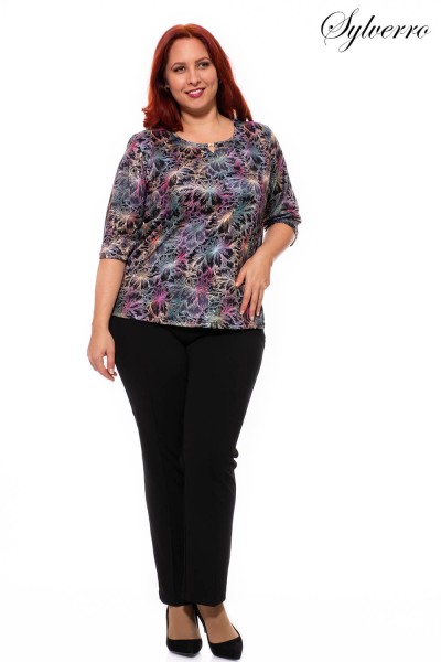The front is a round neckline, highlighted with a small stone decoration, not too tight-fitting top. It gently follows the body line, is hip-length, and has 3/4 sleeves. It is not clingy, made of beautiful, sophisticated material, so you can wear it for any occasion. Its surface is made even more special with a gold print.