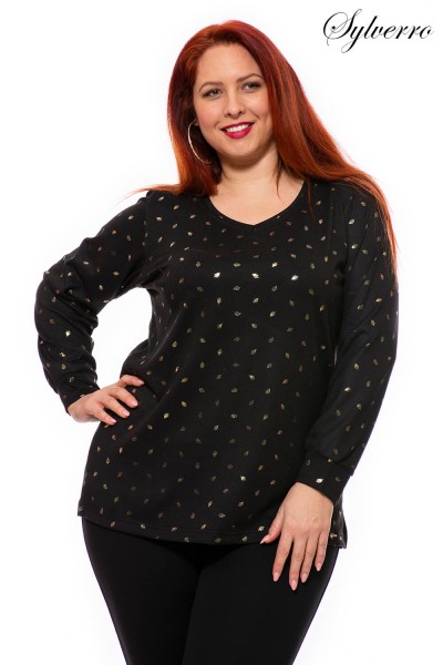 Thin, beautiful surface, good-looking knit material, downward “A”-line top. Decorated with small gold daubing on the surface. Stretchy “V” neckline, long sleeves. You can wear it for occasions and everyday wear.