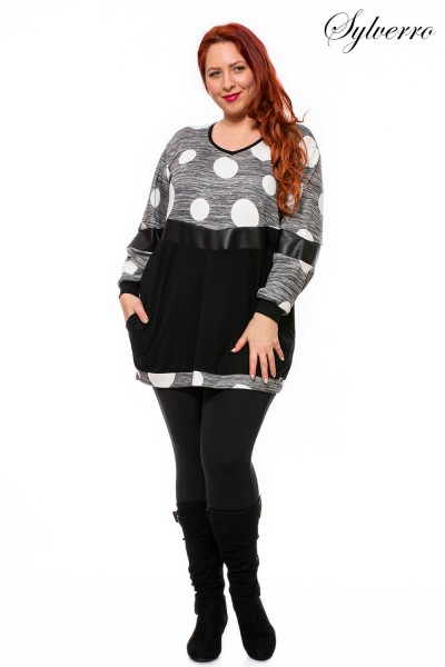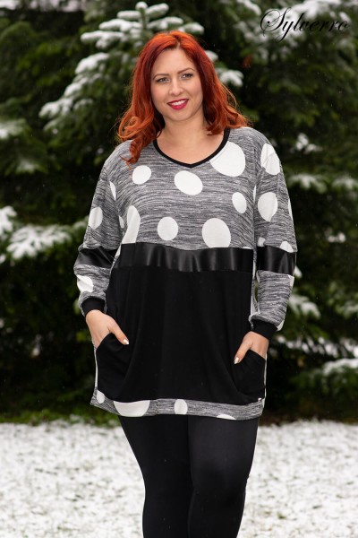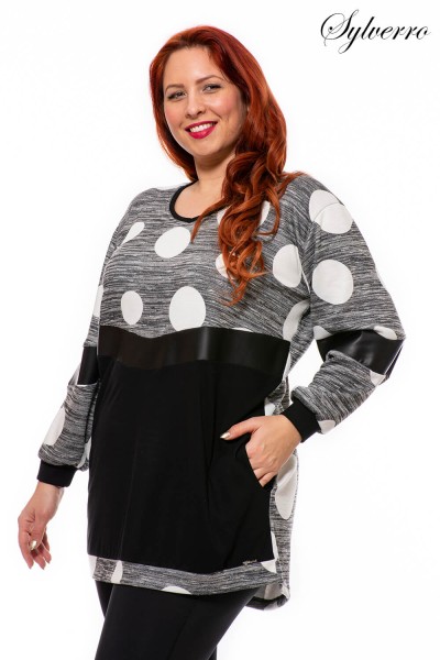 An extended, mid-thigh length sweatshirt made of faux leather and a solid black insert. The material is moderately warm, making it comfortable to wear all day long. A fashionable top with pockets and a “V” neckline. The model is 185 cm tall, so she looks shorter on her.
