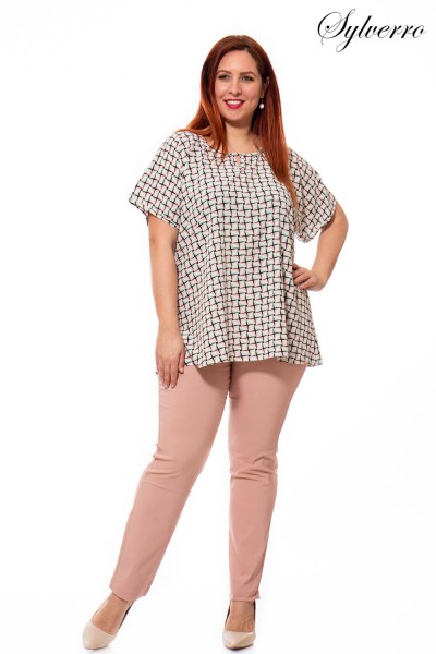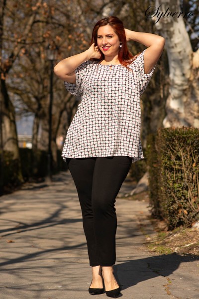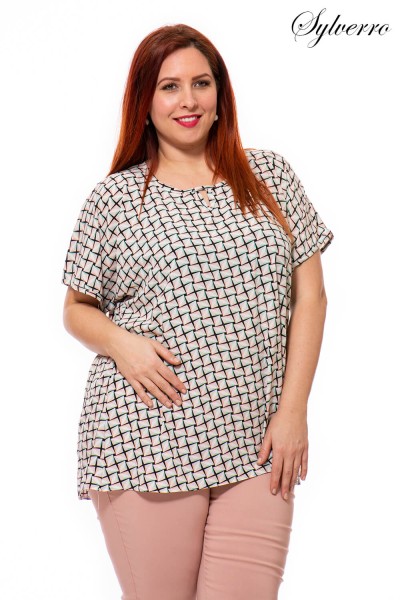 Loose-fitting, thin, well-fitting cotton plaid top. Short sleeves, slightly longer at the back, side slits, small collar, and a small pull at the front.