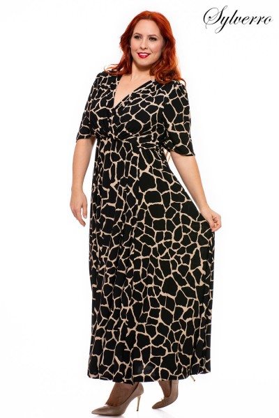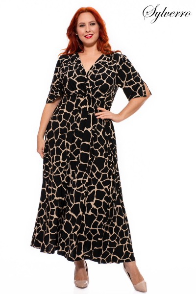 Maxi dress with a pretty opening on the left thigh, which is partially hidden by the wide skirt. The overlapping cut of the upper part gives a feminine cleavage and a fashionable look. The dress has an elastic waist and is placed under the bust. A comfortable, elegant and youthful dress, which is highlighted even more by the beautiful material.