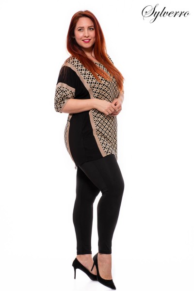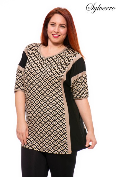 An elongated top with elbow-length sleeves and a beautiful “V” neckline. The black side insert and faux leather stripes stretch and slim the figure.